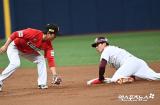 최주환 '러닝스로우로 아웃 시도'[포토]