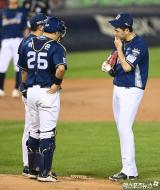 만루 위기에 마운드 오른 손민한 투수코치[포토]