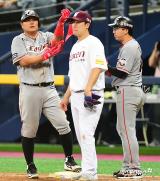 한용덕 감독 '김태균과 하이파이브'[포토]