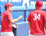 최원준 '최형우와 대화 나누며 그라운드로'[포토]