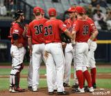 마운드에 모인 캐나다 선수들[포토]