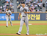 엄상백 '먼지가 많아 마스크 착용'[포토]
