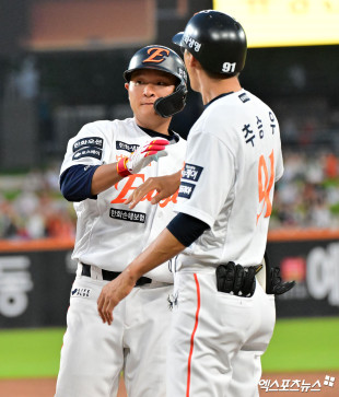 류현진-김태연 ‘함께 지켜보는 채은성의 타구’[포토]
