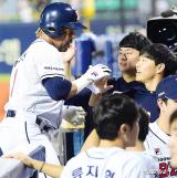 김태형 감독 '박세혁 투런포를 축하해주며'[포토]