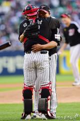 이상훈 '시구 마친 뒤 유강남과 뜨거운 포옹'[포토]