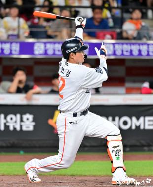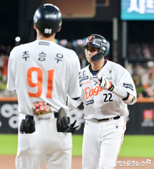 류현진-김태연 ‘함께 지켜보는 채은성의 타구’[포토]