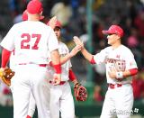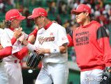 힐만 감독 '선수들과 하이파이브'[포토]