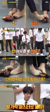 '아형' 방탄소년단 진, 발가락으로 봉지 뜯기 5연승 '깜짝'