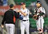 강상수 투수코치와 이야기 나누는 윌슨-유강남[포토]