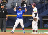 김성윤 '더그아웃 앞에서 퍼포먼스'[포토]