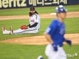 켈리 '넘어져도 강민호 잡는다'[포토]
