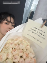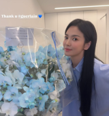 송혜교, 뜻밖에 꽃다발 선물에 활짝…매혹적인 진한 스모키 [★해시태그]