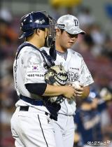 함덕주-양의지 '빗속에서 지켜낸 승리'[포토]