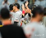 한용덕 감독 '김태균과 하이파이브'[포토]